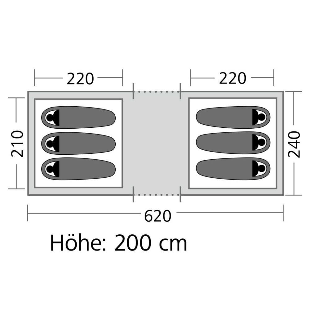 Zelt mit gegenüberliegenden Schlafkabinen. Das Außenzelt wird zuerst aufgebaut und dann das Innenzelt eingehängt. Das hat den Vorteil, dass das Innenzelt bei regnerischen Wetter trocken bleibt. Tagsüber kann das Innenzelt zur Wohnraumvergrößerung ausgehängt werden. Die Eingänge mit der Schlafkabinen mit ganzflächigen Moskitonetztüren bieten optimale Belüftung und Insektenschutz. Organizer, Lampenhalter und Innenzelttaschen runden die Ausstattung ab.