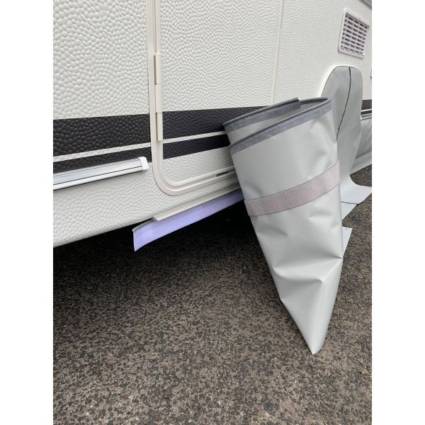 Damit kann bei dieser Art von Caravans ein Klettband per Keder unterhalb der Tür in die Kederleiste eingeführt werden. Das selbstklebende Gegenstück wird dazu auf der Innenseite der Bodenschürze angebracht. Abschließend wird mit einer stabilen Schere der Materialüberstand im Türbereich ausgeschnitten.